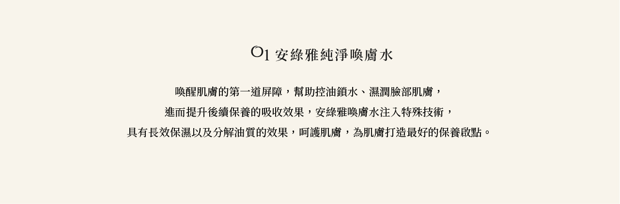 幫助控油鎖水、濕潤臉部肌膚,進而提升後續保養的吸收效果,安綠雅喚膚水注入特殊技術,具有長效保濕以及分解油質的效果,呵護肌膚,為肌膚打造最好的保養啟點。