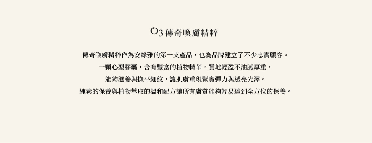 O3傳奇喚膚精粹為安綠雅的第一支產品,品牌最經典全植物成分暢銷商品!